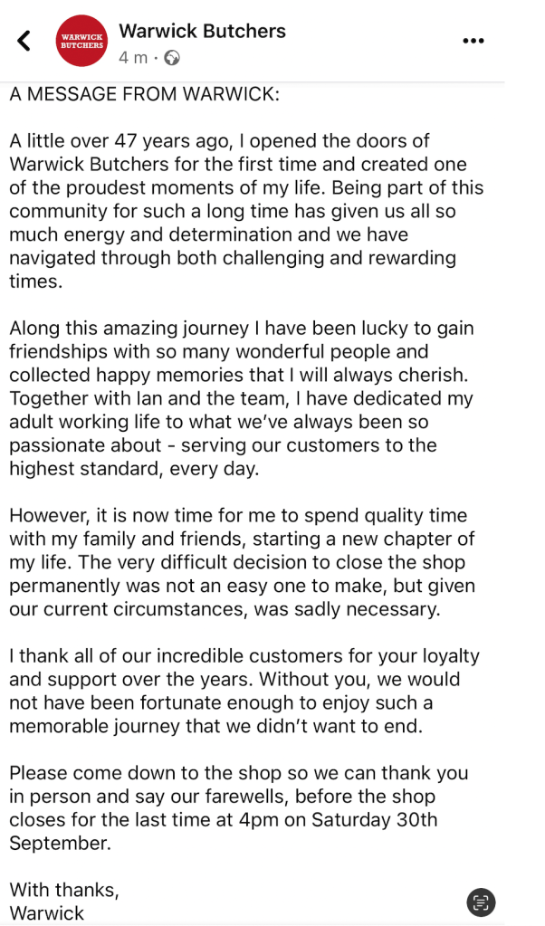Meat quality has always been brilliant and continues to be so and always got my turkey from there. Likes of Asda is just trash in comparison and yet this fabulous place is closing.