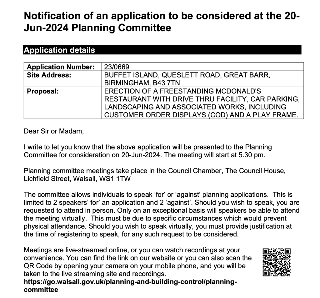 I have just received the following email for the planning decision on McDonalds to be decided on the 20th June. I have made my stance perfectly clear on this and my letter was clear on my reasons against this. Therefore I see no reason to attend the meeting to repeat this.